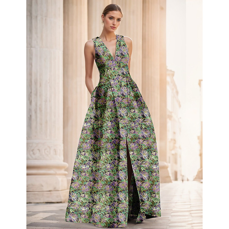 A-Line Sheath Column Floor Length Evening Gown Ball Gown with Overskirt Elegant Glittering Floral Sleeveless V Neck Evening Party Wedding Satin with Floral Print Sequin Slit