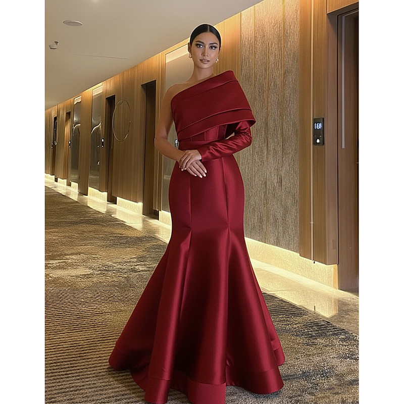 Mermaid Trumpet Floor Length Prom Dresses Evening Gown Ball Gown Formal Dress Elegant Glittering Celebrity Style Long Sleeve One Shoulder Garden Party Wedding Stretch Satin with Pleats