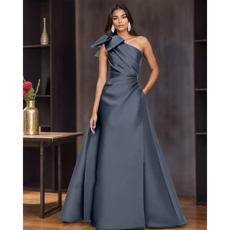 A-Line Floor Length Evening Gown Ball Gown Formal Dress Elegant Party Sleeveless One Shoulder Evening Party Garden Party Satin with Bow(s) Pleats