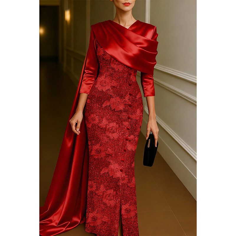 Sheath Column Floor Length Beaded Eembroidered Formal Dresses Mother of the Bride Dress Ball Gown with Cape Evening Gown Formal Dress Elegant Sparkle Long Sleeve Stand Collar Wedding Formal Satin