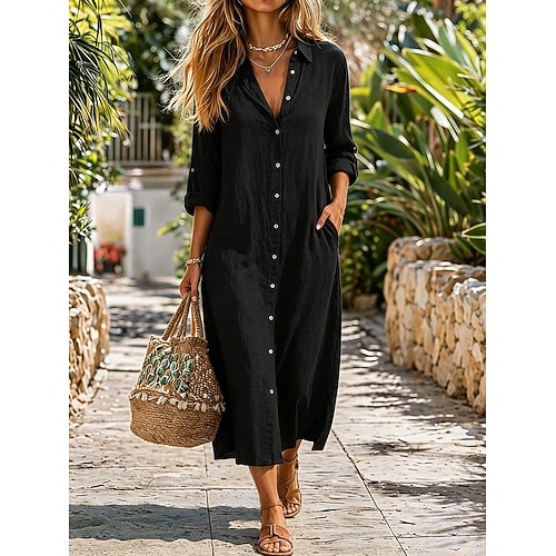 Per donna Abito Lungo Maxi Abito 100% lino Abito Camicia Abiti in cotone e lino Abito in lino Essenziale Casual Casuale Quotidiano Vacanza Vestibilità comoda Semplice Mezza Manica Colletto a Camicia