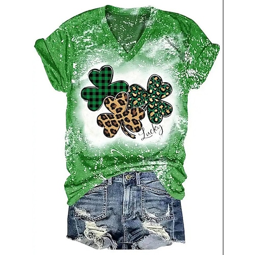 T-Shirt da donna per il giorno di San Patrizio Grafica Quadrifoglio Vintage Elegante Classico Maniche Corte V Collo Top Regolari Quotidiani Stampa Verde Estate Primavera