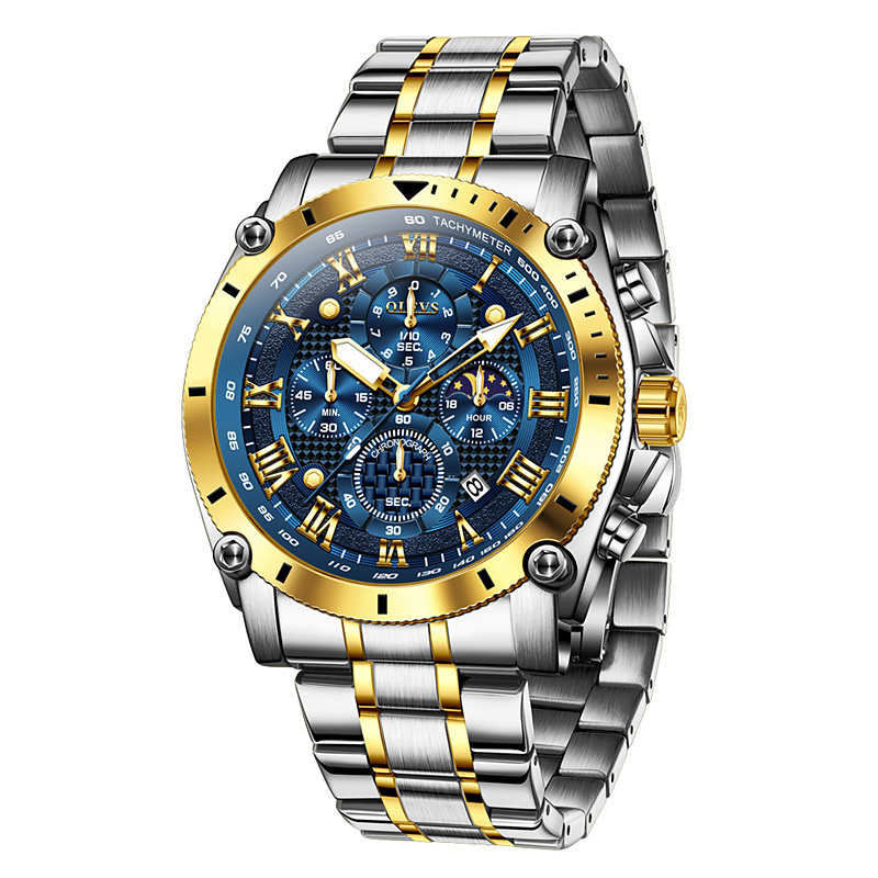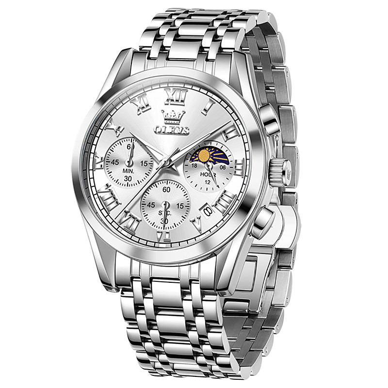 The New Olevs Men'S Steel Band Business Watch Moon Phase Luminous Calendar Chronograph 24-Hour Indication Quartz Watch Is A Fashionable Casual And Versatile Waterproof Sports Wristwatch