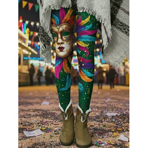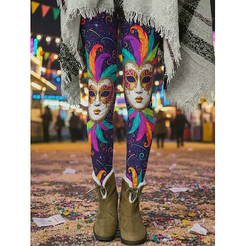 Karnevals-Leggings für Damen, bequeme Leggings im Vintage- und Ethno-Stil, lange Hose mit hohem Bund, Grafikprint, bequem, hochelastisch, lässig, für Alltag und Urlaub, in Blau, Gelb, Rot und Lila,