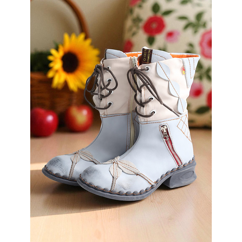 Women's Red Leather Ankle Boots with Floral Appliqué – Vintage Mid-Heel Short Boots for Casual and Dressy Outfits