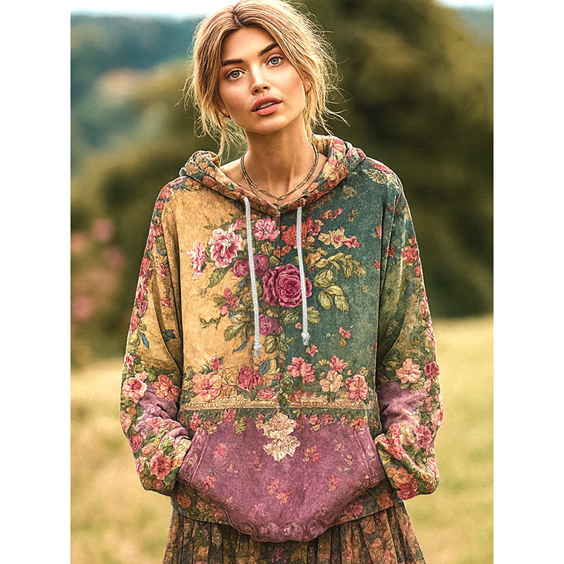 Women's 3D Print Vintage Boho Hoodie Patchwork Hoodie Sweatshirt Floral Pullover Casual Long Sleeve Hooded Street Dailywear Patchwork Print Front Pocket Light Green Dark Pink Navy Spring Fall Winter
