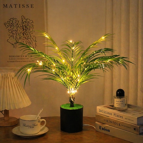 Luce notturna a LED realistica con pianta in vaso, alimentata tramite USB, con foglie di palma, monstera ed eucalipto – illuminazione decorativa per interni per camera da letto, soggiorno, studio,