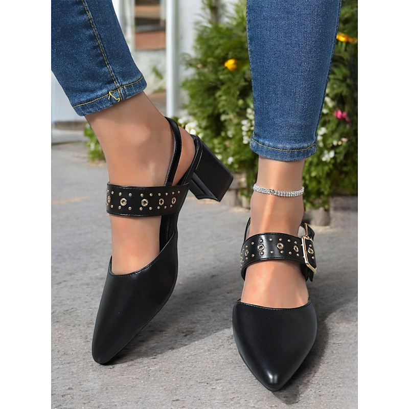 Women's Beige Pointed-Toe Block Heel Sandals with Studded Buckle Straps – Stylish and Comfortable for Work, Parties and Casual Wear