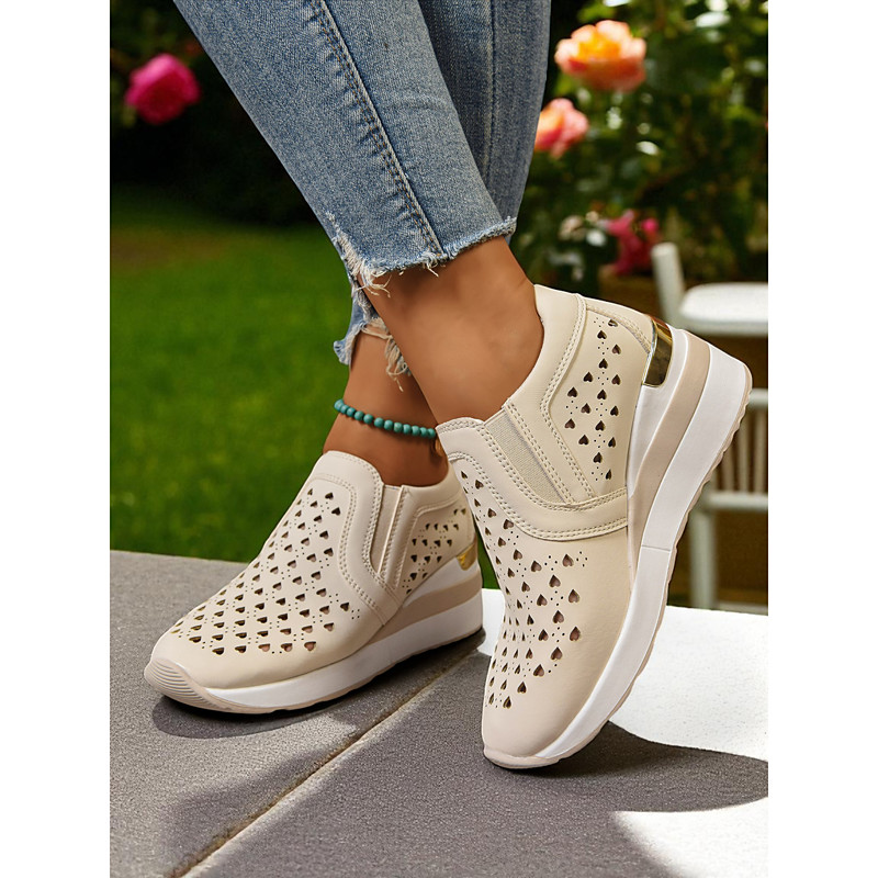 Women's Pink Wedge Sneakers – Breathable Cutout Slip-On Walking Shoes with Gold Heel Detail for Travel, Work and Summer Outings