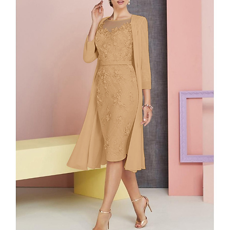 Two Piece Sheath Column Knee Length Wedding Guest Dress Mother of the Bride Dress 3/4 Length Sleeve Bateau Neck Elegant Vintage Plus Size Wedding Guest Church Chiffon Lace Jacket Dresses with