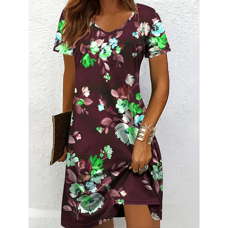 Women's Mini Dress Casual Dress T Shirt Dress Tee Dress Sundress A Line Dress Vacation Casual Boho Beach Regular Fit Floral Graphic Short Sleeve V Neck Red Blue Purple Brown Summer Spring