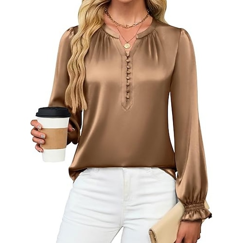 Per donna Blusa Top Eleganti Semplice Elegante Vintage Signore Manica Lunga Scollo a V Top Regolari Lavoro Quotidiano Ferie Arricciato Bottoni Nero Rosso Viola chiaro Grigio chiaro Grigio scuro