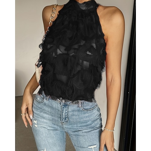 Per donna Maglietta Canotta Tinta unica Elegante Moda Senza Maniche Collo Alto Top Regolari Quotidiano Uscire Weekend Rete Nero Rosso Cachi Estate Primavera