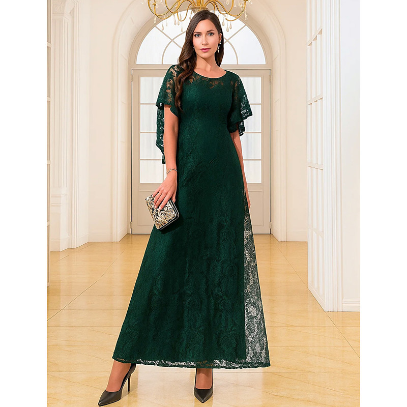 A-Line Floor Length Wedding Guest Dress Formal Dresses Evening Gown Mother of the Bride Dress Short Sleeve Crew Neck Elegant Vintage Party Lace with Lace