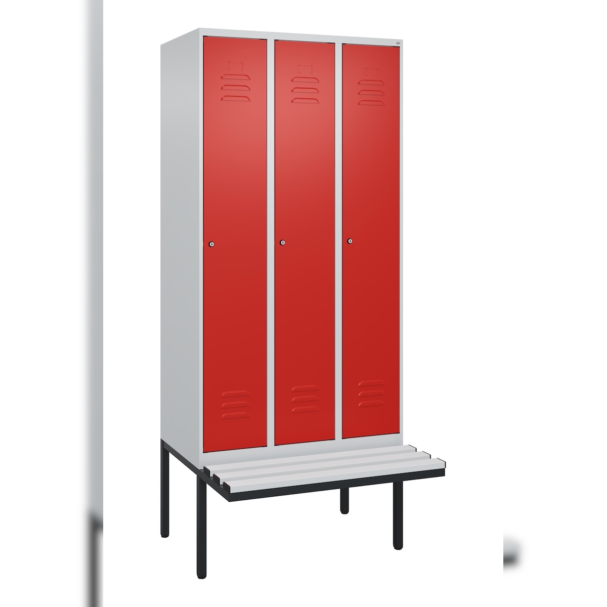 C+P Spind Classic PLUS, Kunststoff schwebende Sitzbank, 3 Abteile, HxBxT 212x90x82cm, Zylinderschloss, Hellgrau/Rot von PROREGAL