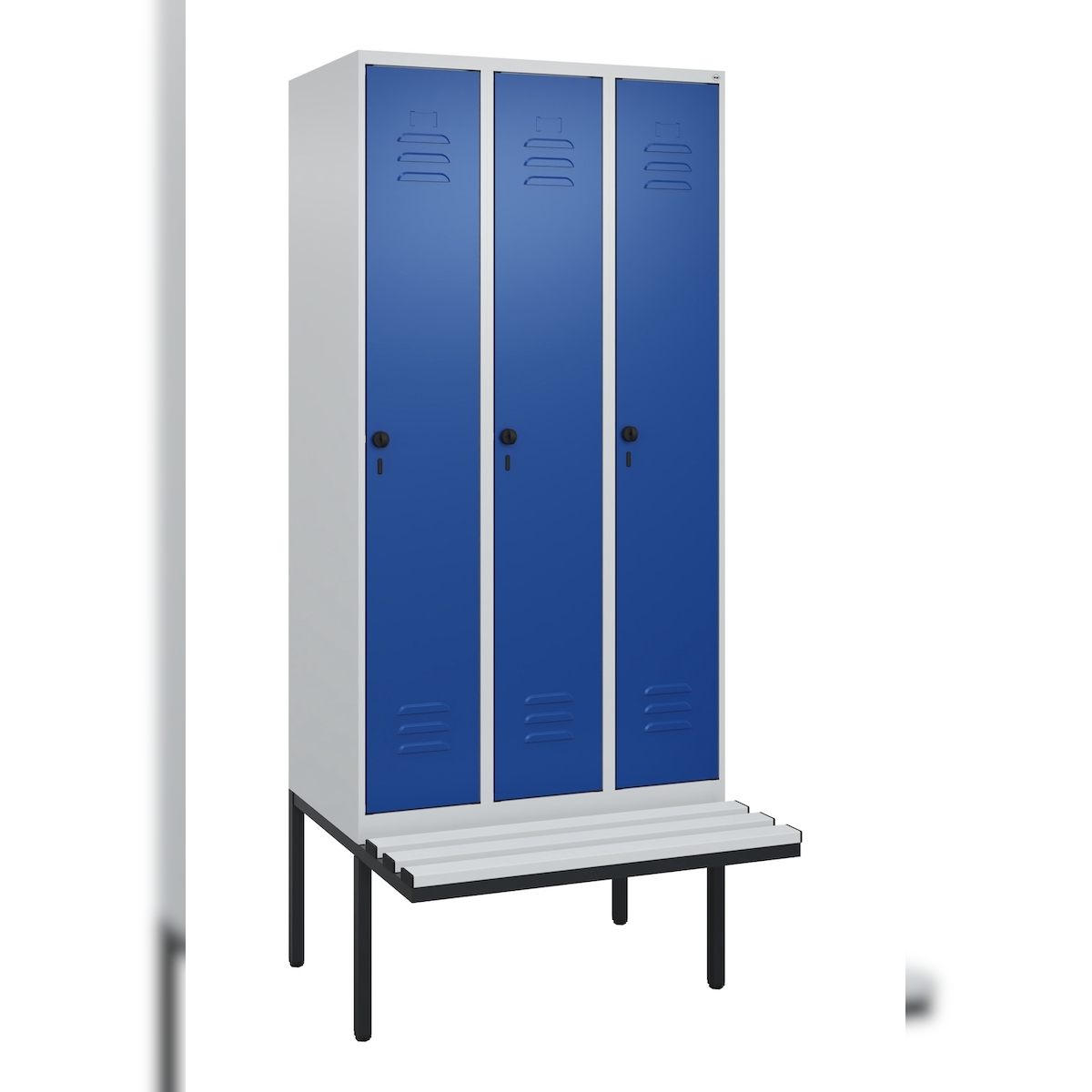 C+P Spind Classic PLUS, Kunststoff schwebende Sitzbank, 3 Abteile, HxBxT 212x90x82cm, Sicherheitsdrehriegel, Hellgrau/Enzianblau von PROREGAL