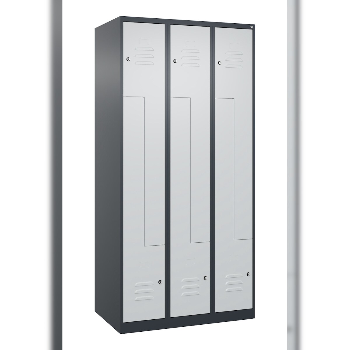 kaiserkraft Z-Spind Fydor, 3 Abteile, lichtgrau, B 1200 mm, flache Dachform, Vorhängeschloss