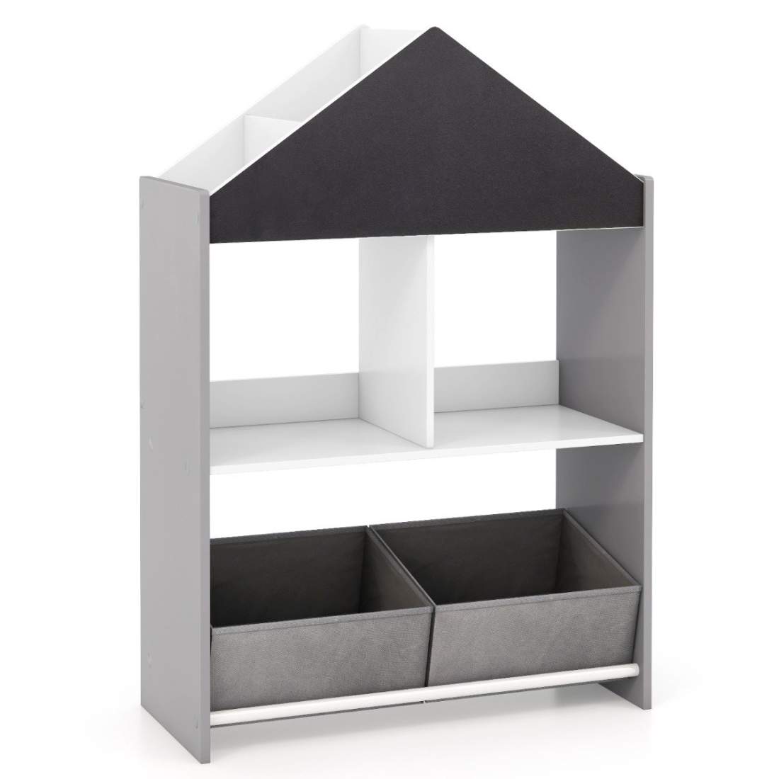 Barnebokhylle med tavle og 2 bokser – grå, 6 hyller