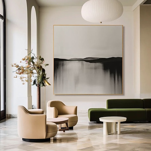Quadro su tela dipinto a mano in bianco e nero con paesaggio lacustre, cielo nero, riflessi, decorazione murale moderna per soggiorno