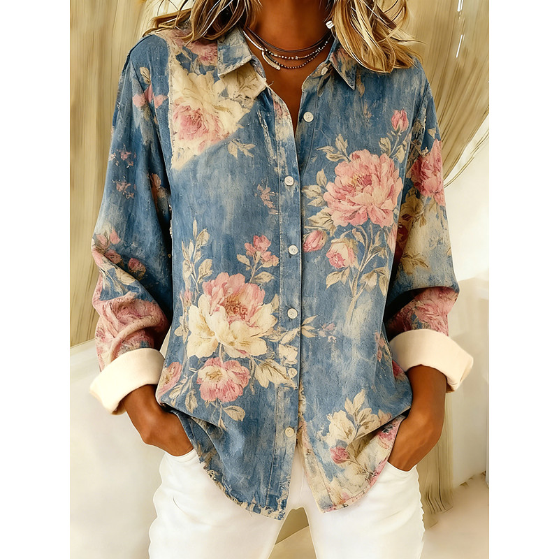 Women's Shirt Floral Bohemia Casual Long Sleeve Shirt Collar Crop Tops Daily Buttons Print Blue Spring Fall Winter