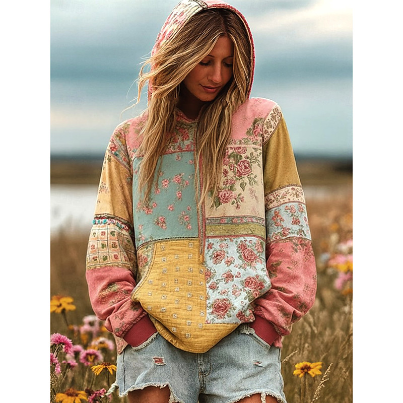 Women's 3D Print Vintage Boho Hoodie Patchwork Hoodie Sweatshirt Floral Pullover Sweatshirt Elegant Warm Active Long Sleeve Hooded Street Dailywear Casual Patchwork Print Pink Spring Fall Winter