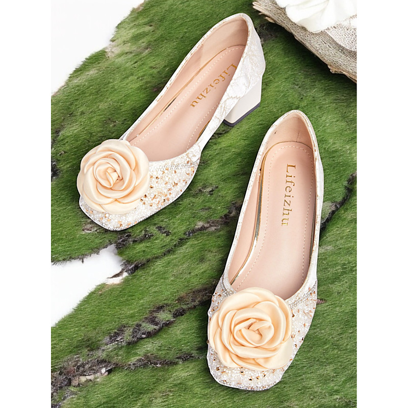 White Glitter Pumps with Floral Appliqué – Elegant Women's Wedding Shoes