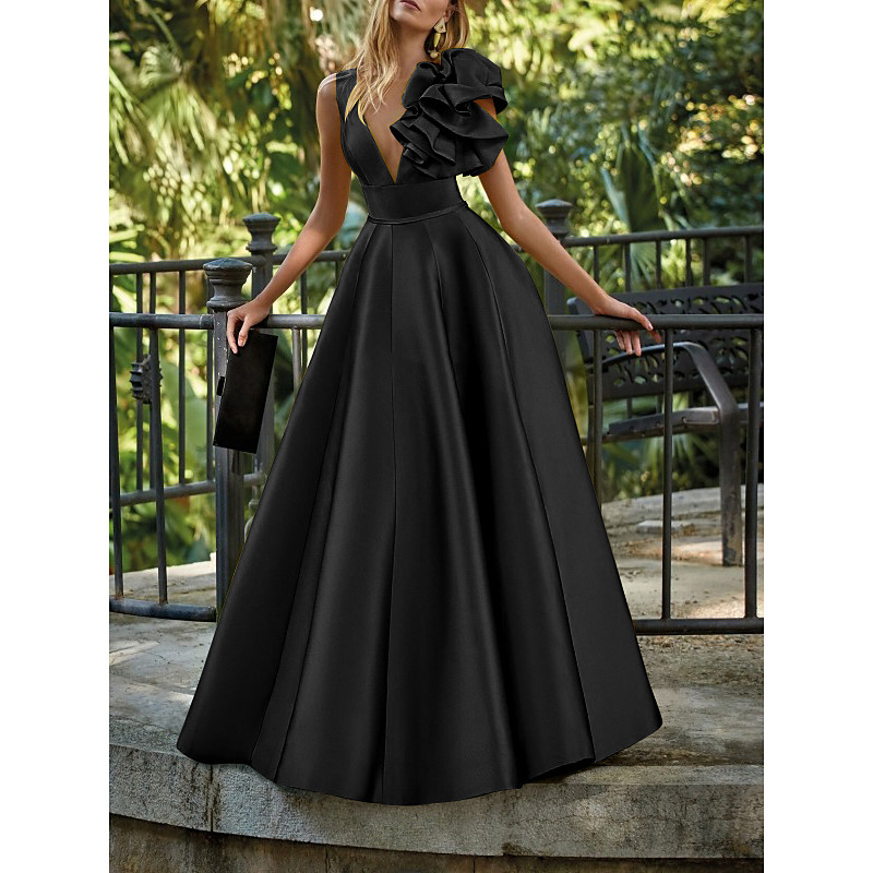 A-Line Floor Length Prom Dresses Evening Gown Ball Gown Formal Dress Elegant Party Sleeveless V Neck Formal Wedding Guest Satin with Shouder Flower