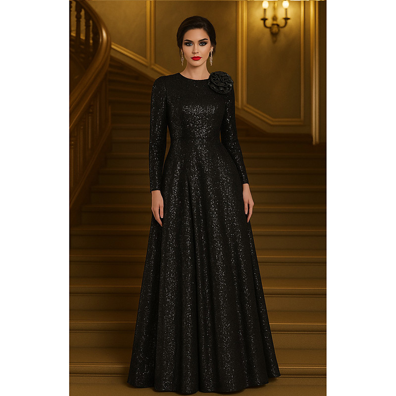 A-Line Floor Length Evening Gown Ball Gown Formal Dress Elegant Glittering Silky Long Sleeve Crew Neck Wedding Formal Pocket Sequined with Glitter