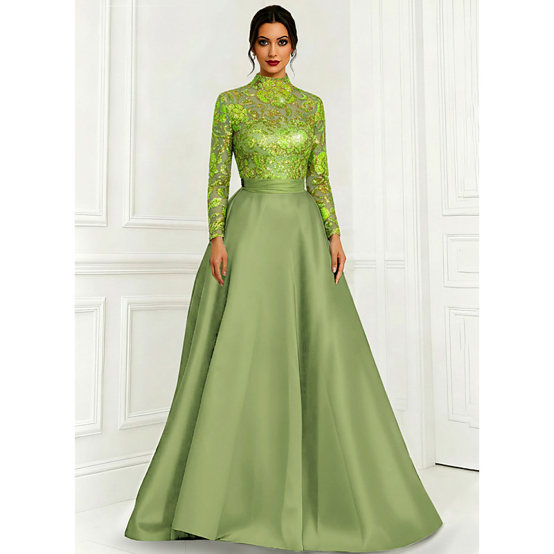A-Line Floor Length Beaded Eembroidered Formal Dresses Mother of the Bride Dress Evening Gown Ball Gown with Overskirt Formal Dress Elegant Sparkle Silky Long Sleeve High Neck Wedding Formal Satin