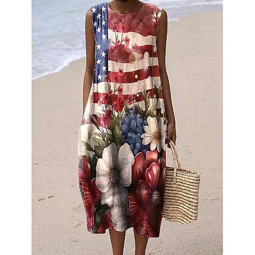 Giorno dell'Indipendenza Americana Per donna Abito Midi Abito a Tubino Vestito Estivo Vacanza Festa Casual Quotidiano Vestibilità regolare Vestibilità comoda Bandiera Senza Maniche Girocollo Blu
