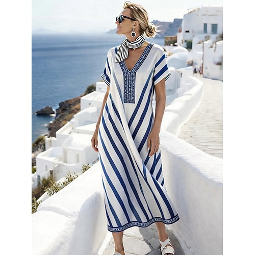 Per donna Abito maxi 100% cotone Abito a Tubino Abito Camicia Vestito a caftano Essenziale Casual Quotidiano All'aperto Vacanza Vestibilità comoda A righe Manica Lunga Colletto a Camicia Blu Nero