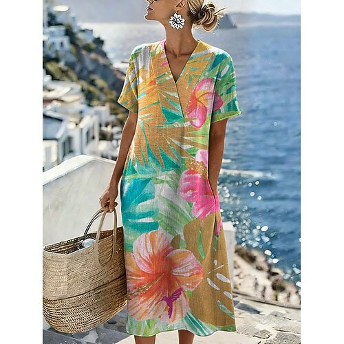 Per donna Abito Midi Vestito Estivo Vestito Casual Vacanza Casual Spiaggia Spiaggia Feste Vestibilità comoda Grafico Foglia Geometrico Manica Corta Scollo a V Blu Giallo Viola Verde Estate Primavera