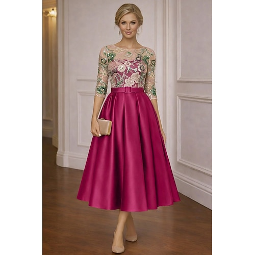 Linea ad A Lunghezza Tè Perline ricamate Abito Formale Abito da madre della sposa Abiti da Cocktail Abiti da festa Elegante Manica 3/4 Girocollo Festa in giardino Matrimonio Raso Pizzo con Pieghe