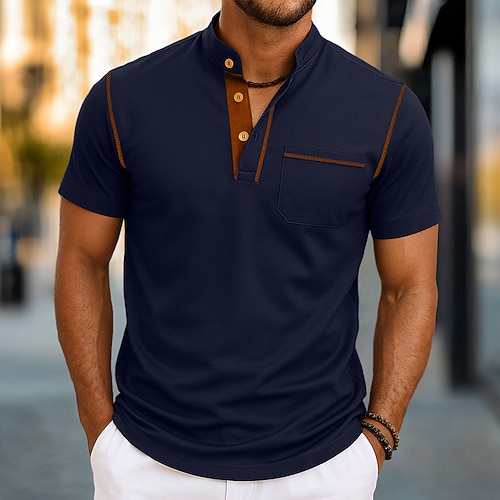 Herren Henley Hemd T-Shirt Kurzarm Stehkragen Henley Sommer Frühling Herbst Einfarbig Einfach Lässig Smart Casual Tasche Knöpfe Outdoor Lässig Täglich Schwarz Grün Marineblau Top T-Shirt für Herren