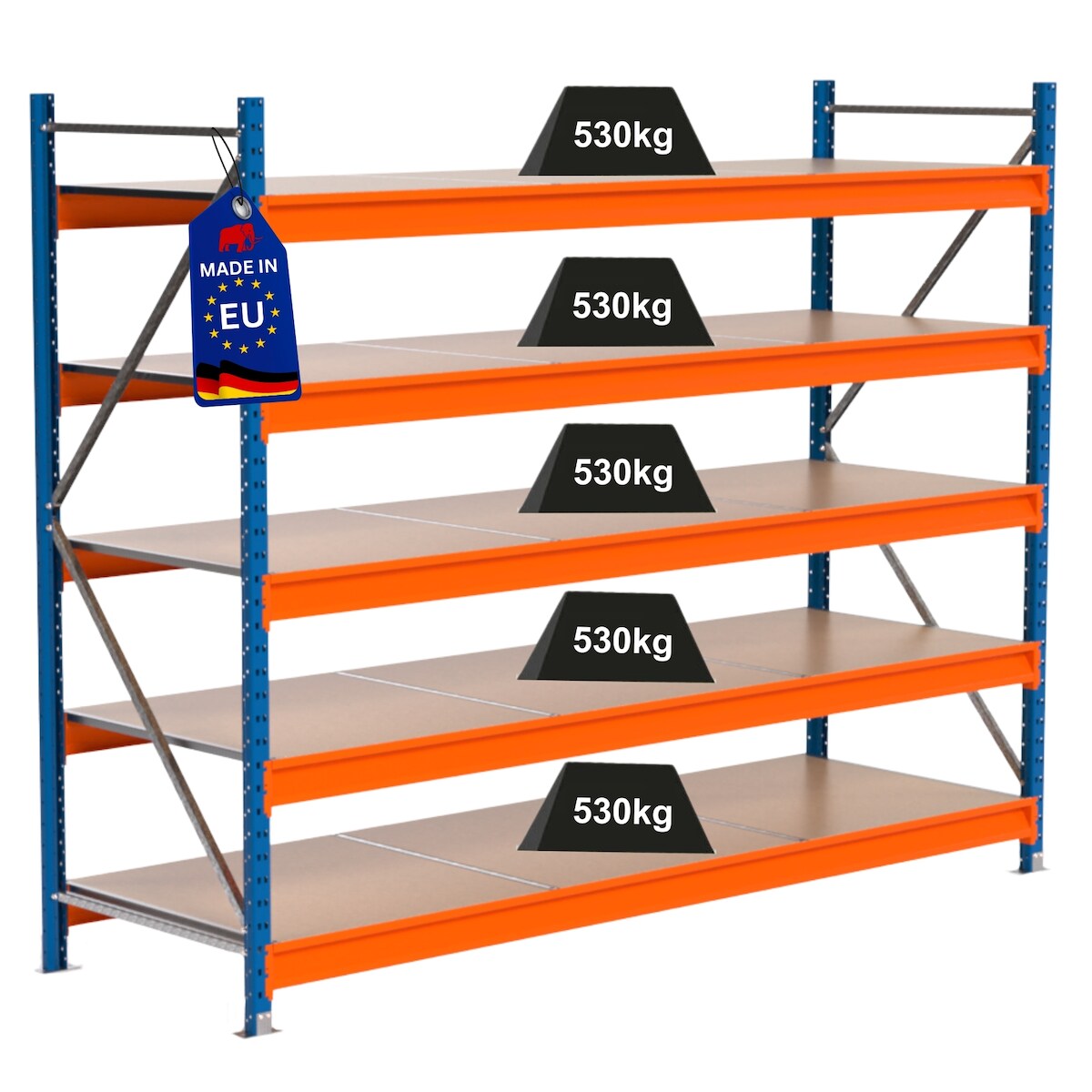 PROREGAL Industrie Schwerlastregal MAXIMUS PRO, Grundregal, HxBxT 200x250x80cm, 5 Ebenen, Spanplatten-Fachboden, Fachlast 530 kg, Blau/Orange