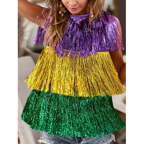 Blusa da donna Carnival color block alla moda casual senza maniche collo tondo ampio festività frange viola primavera