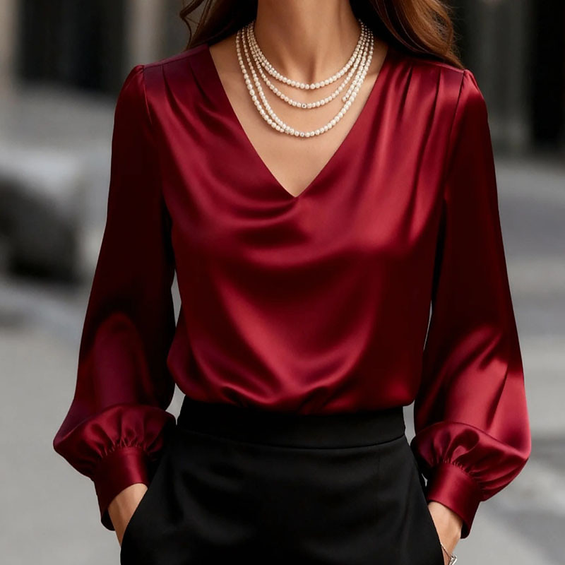 Women's Shirt Blouse Satin Dressy Tops Plain Elegant Stylish Casual Long Sleeve V Neck Regular Tops Daily Holiday Going out Ruched Black White Red Apricot Spring Fall Winter
