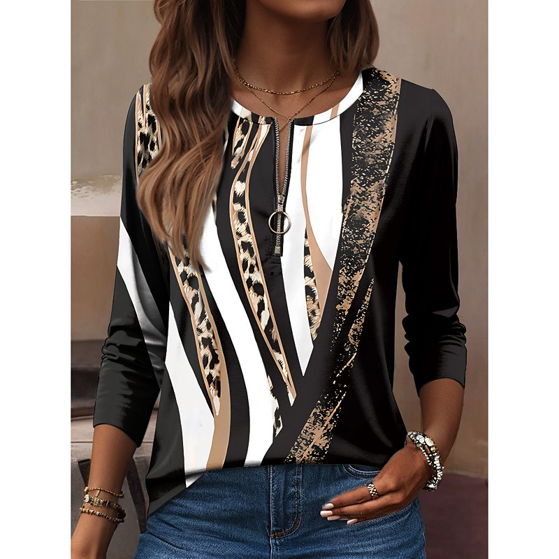 Women's T Shirt Graphic Leopard Fashion Casual Long Sleeve Crew Neck Regular Tops Daily Zipper Print Black Brown Khaki Spring Fall Winter