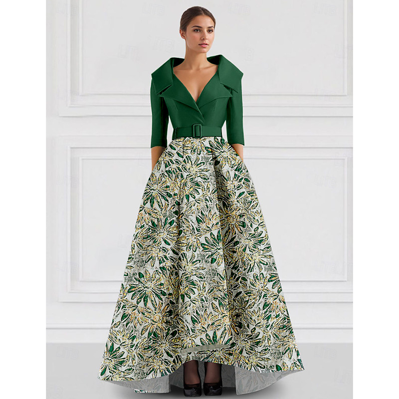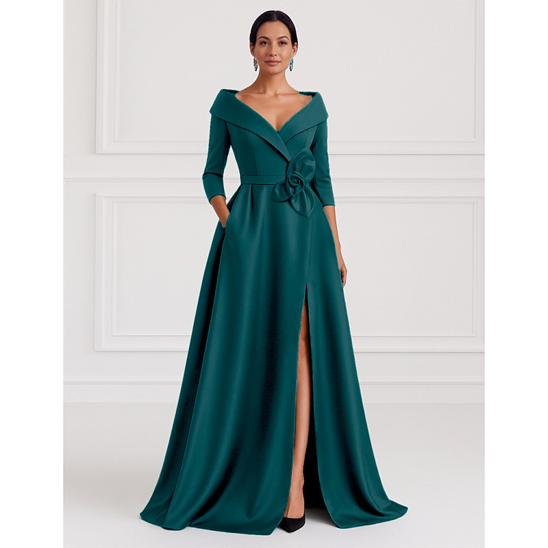 A-Line Floor Length Evening Gown Ball Gown Formal Dress Elegant Silky 3/4 Length Sleeve Shirt Collar Wedding Formal Pocket Stretch Satin with Shouder Flower
