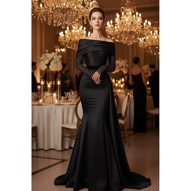 Sheath Column Sweep Brush Train Evening Gown Ball Gown Formal Dress High Split 3/4 Length Sleeve Off Shoulder Formal Wedding Guest Charmeuse with Bow(s) Sequin Slit