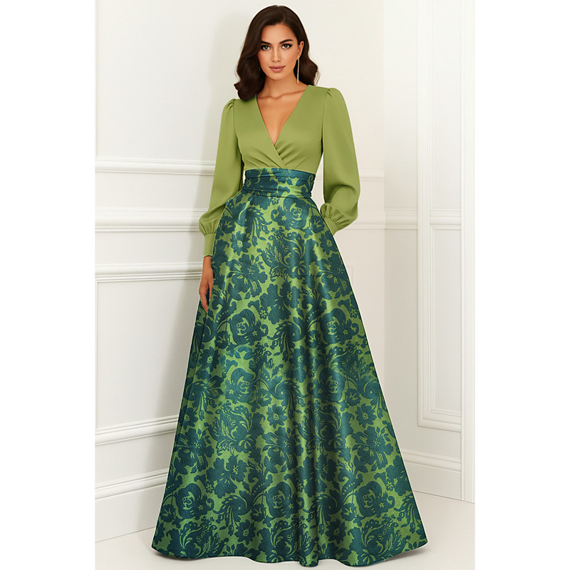A-Line Floor Length Evening Gown Ball Gown Formal Dress Elegant Vintage Color Block Long Sleeve V Neck Wedding Formal Pocket Satin Nylon with Floral Print Pocket