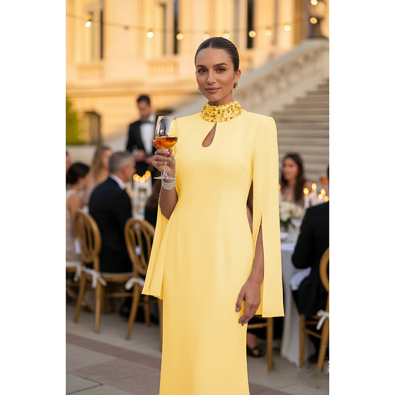 Sheath Column Floor Length Ball Gown with Cape Evening Gown Formal Dress Elegant Celebrity Style Long Sleeve High Neck Garden Party Wedding Satin with Glitter Shawl