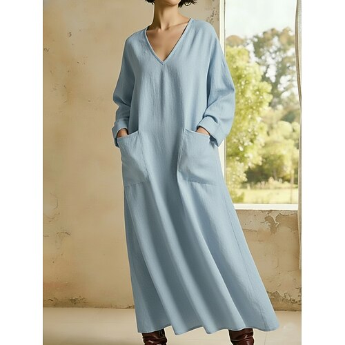 Per donna Abito maxi Finto cotone e lino Vestito Casual Elegante Moda Moderno All'aperto Vacanza Uscire Vestibilità comoda Semplice Manica Lunga Scollo a V Bianco Giallo Borgogna Cachi Estate