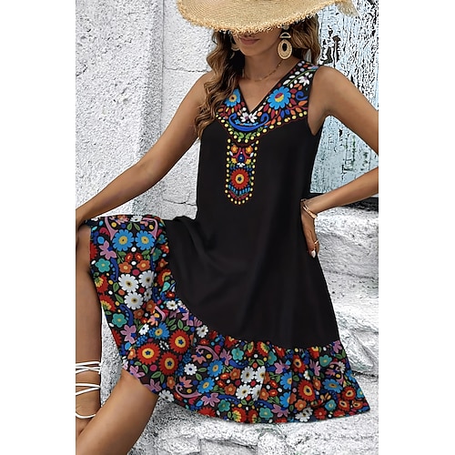 Per donna Mini Abito Vestito Estivo Abito a trapezio Abito Estivo Casual Quotidiano Ferie Vestibilità comoda Floreale Grafico Tribale Senza Maniche Scollo a V Nero Beige Estate Primavera