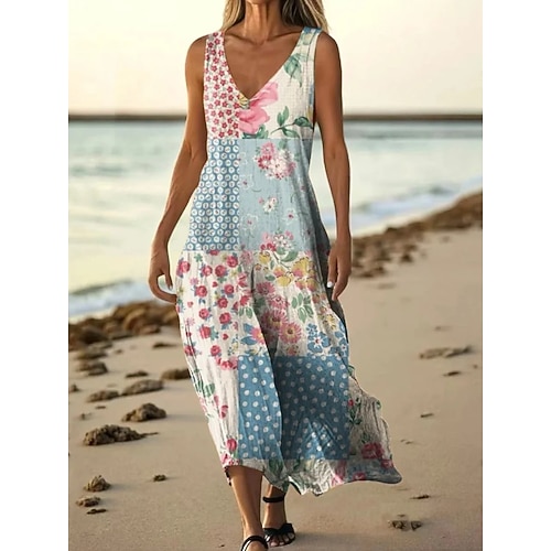 Per donna Abito Midi Abito Boho Abito Vintage Vestito Casual Vintage Vestibilità comoda Floreale Senza Maniche Scollo a V Giallo Rosso Azzurro cielo Viola Estate Primavera