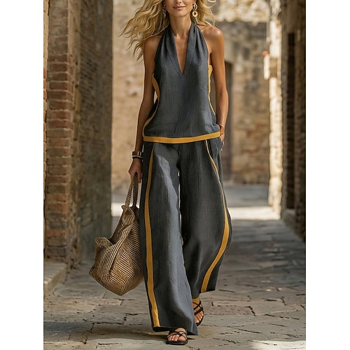Per donna Set di Pantaloni Finto cotone e lino Senza Maniche All'americana Tinta unica Moda Streetwear Casuale Quotidiano All'aperto Blu Verde Cachi Estate Vestibilità comoda