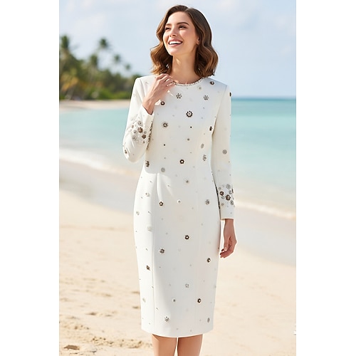 Abito da festa in stile Sheath Column fino al ginocchio Abito da cocktail Abito da sera elegante con maniche lunghe e scollo rotondo per eventi nuziali con cristalli e perline