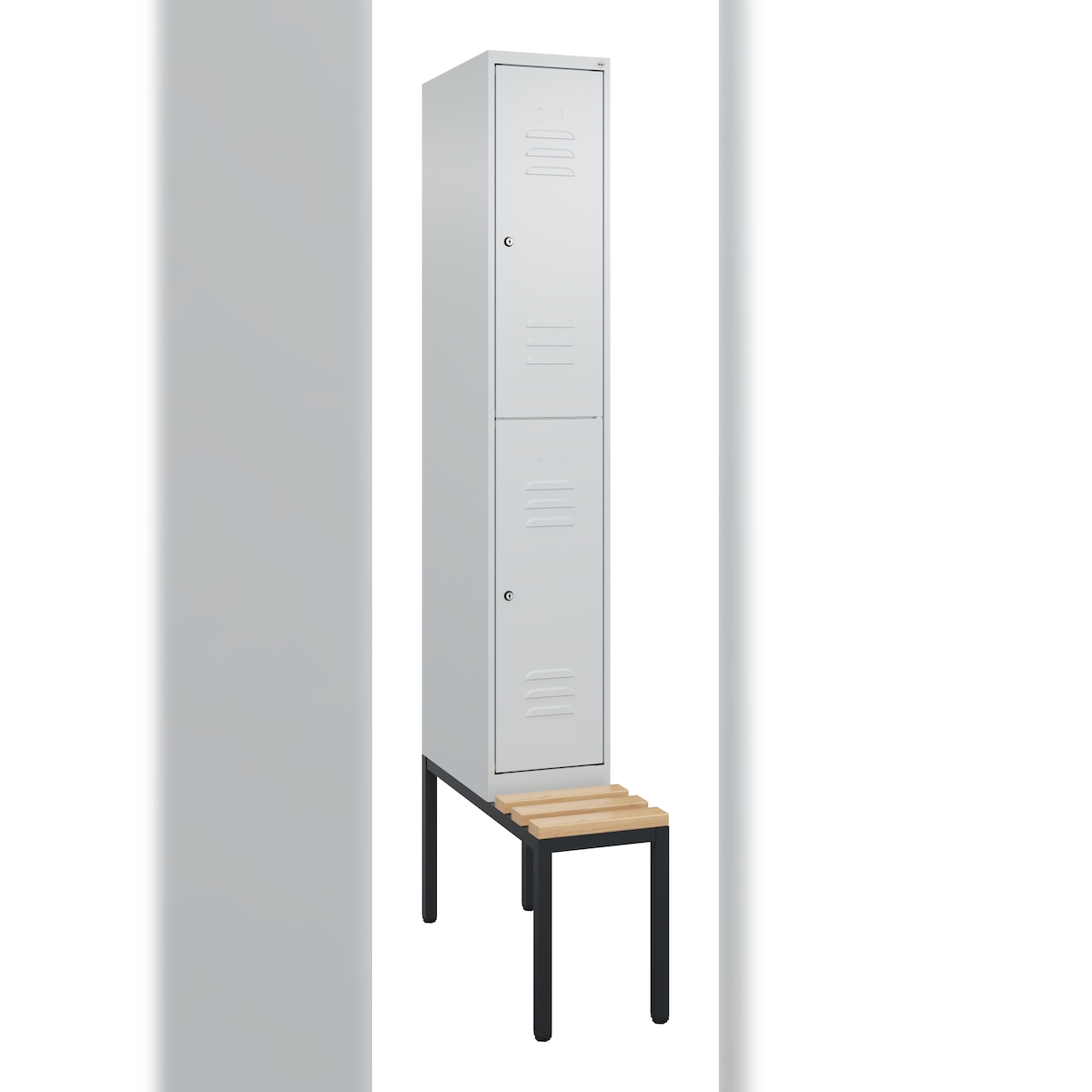 C+P Spind Classic PLUS, Buche untergebaute Sitzbank-Harthol, 2 Abteile, HxBxT 212x30x82cm, Zylinderschloss, Hellgrau/Hellgrau von PROREGAL