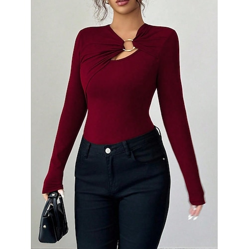 Per donna Blusa Tinta unica Elegante Casual Manica Lunga Collo a U Top Regolari Quotidiano Traforato Blu Nero Rosso Verde Grigio Primavera Autunno Inverno