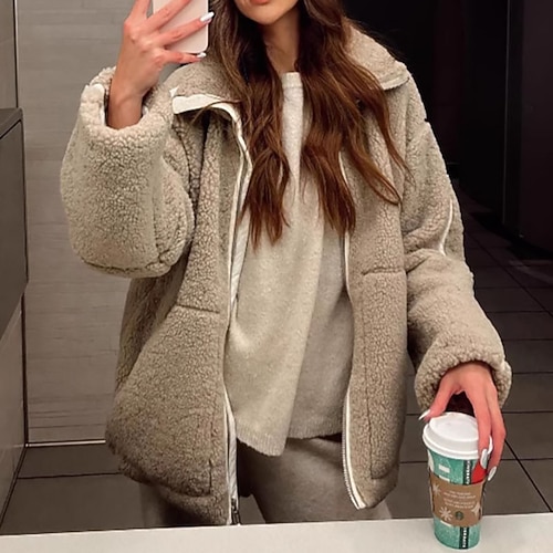 Per donna Cappotto Invernale Cappotto Teddy Caldo Confortevole Cerniera Tasca Moda Casual Tinta unica Vacanza Streetwear Casuale Abbigliamento quotidiano Regolare Collo ripiegato Vestibilità regolare